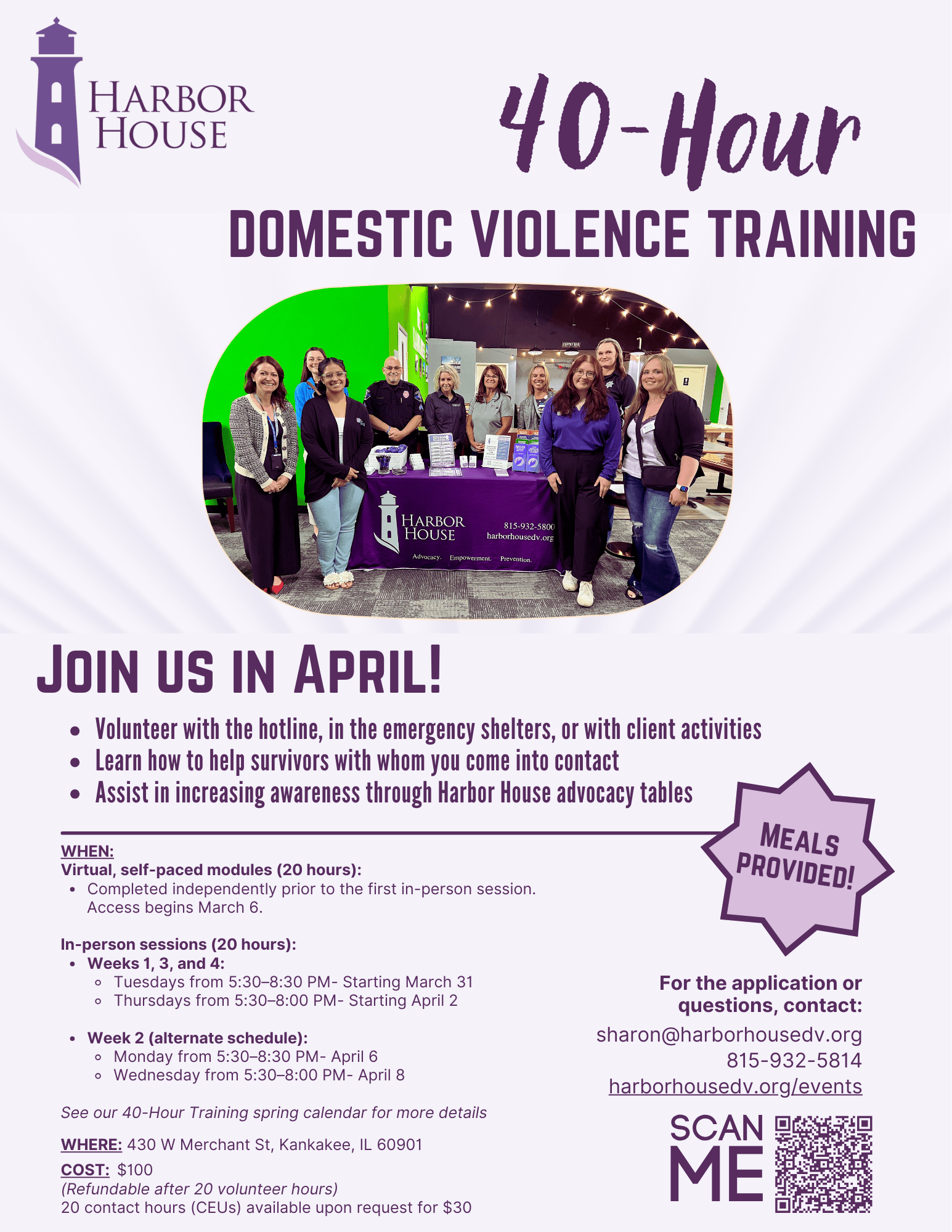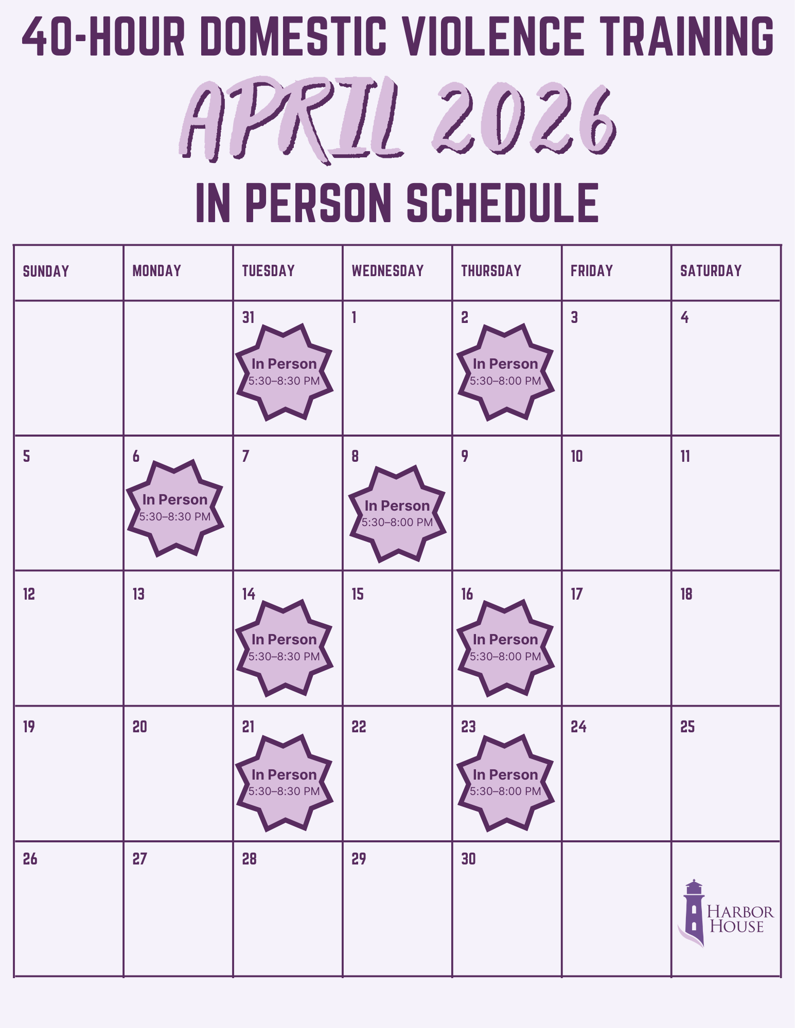 Join us in September for 40-hour Domestic Violence Training! Through this comprehensive training, participants will gain knowledge that is fundamental in addressing domestic violence, supporting survivors, and bettering our community. Volunteers will gain certification that allows them to: